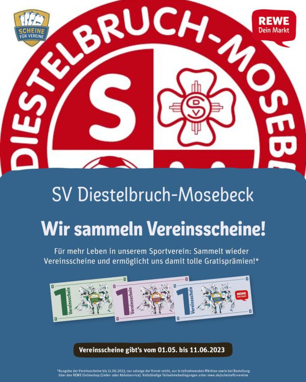 Auch 2023 startet die REWE wieder ihre Aktion "Scheine für Vereine". Im Zeitraum 01.05.2023 - 11.06.2023 gibt es in alle teilnehmenden REWE und NAHKAUF Märkten sowie Online bei einer Bestellung über den REWE Onlineshop (Liefer- und Abholservice) pro 15 € Einkaufswert 1 Vereinsschein gratis - jedoch nur so lange der Vorrat reicht.